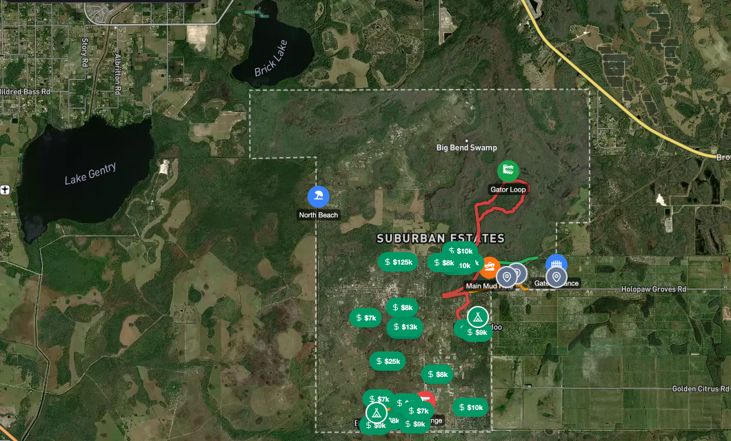 500-acre county park on reclaimed phosphate-mine land near Lakeland. Unique rolling hills carved from mining operations.